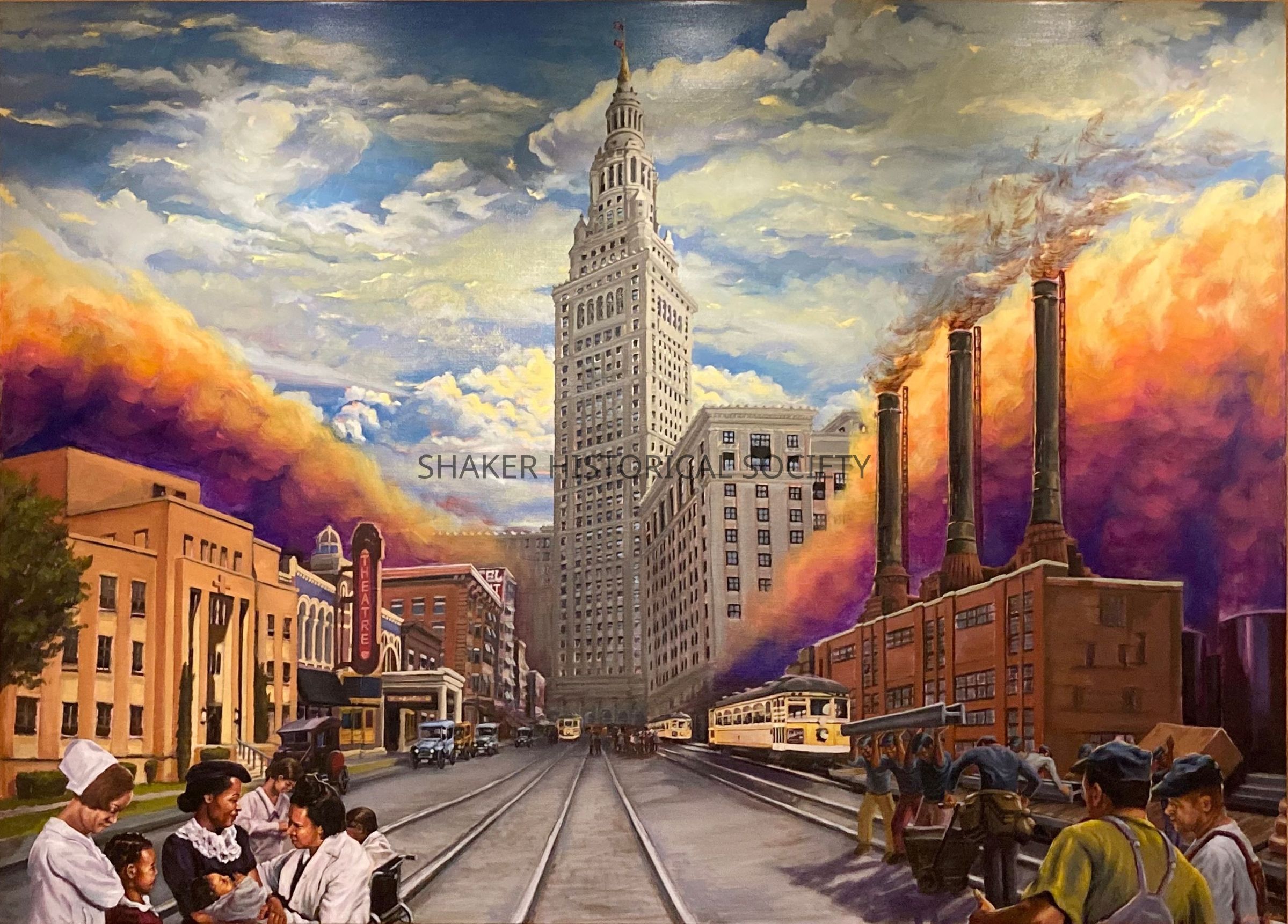 Painted mural on canvas by Ashton Burton celebrating Black Americans' contributions to cities like Cleveland, which indirectly shaped the growth of nearby Shaker Heights in the early twentieth century, during and after the Great Migration. Painting was created as part of the Cleveland Institute of Art's Creativity Works program.Artwork Details