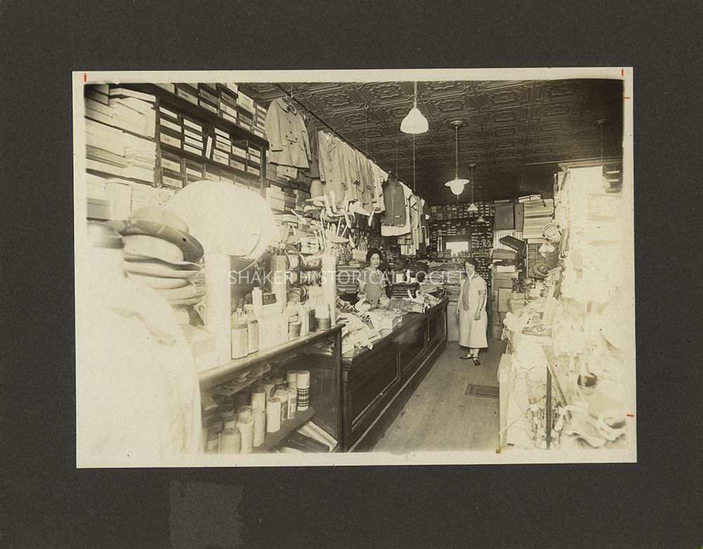 Black-and-white photograph of the A. & H. Hank Dry Goods Store owned by Anna and Helen Hank, half sisters of Mayor William Van Aken. The woman behind the counter is identified on verso as Anna Hank and the year as c.1924. Unknown if the second woman is Helen Hank. Photo is mounted to faded black board.Photograph Details