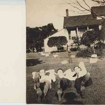 Undated black-and-white photograph of three men lying on the ground at the Van Aken farmhouse located at E. 128th (now Kendall) and North Woodland (now Larchmere). The photo is taped to a piece of paper identifying the people (left to right): William J. Van Aken, Ben Brugge, and Percy Close.Photograph Details