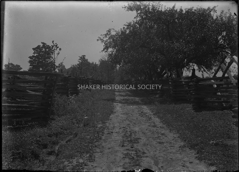 Glass plate negative showing the lane on Sylvester Knittel's property, now the southeast corner of Fairmount Boulevard and Eaton Road, looking south from the barn.Photograph Details