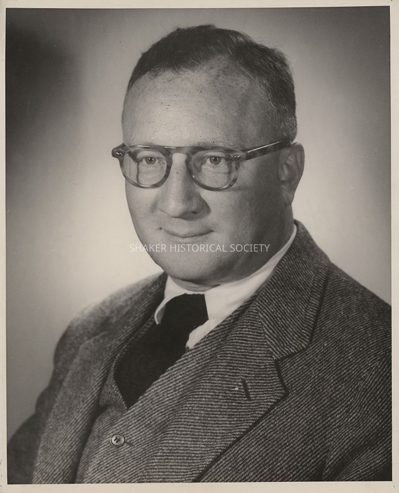 Black-and-white headshot of Alexander Mintz, President of Shaker Savings and Loan Association, wearing a three piece suit and glasses. Handwritten note on verso mentioned the [Shaker Heights] School Review.Photograph Details