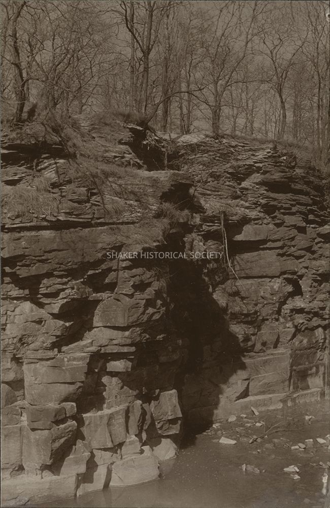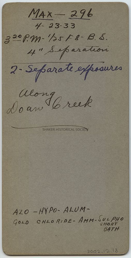 Toned black-and-white stereograph by Ladis Lisy of Doan Brook Gorge. Photographs are mounted on grey board with handwritten notes about the date, location, exposure, and developer on verso.Photograph Details