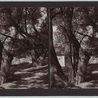 Toned black-and-white stereograph photographs by Ladis Lisy of trees along the banks of Lower Lake. Photographs are mounted on black board with handwritten notes and a white label on verso.Photograph Details