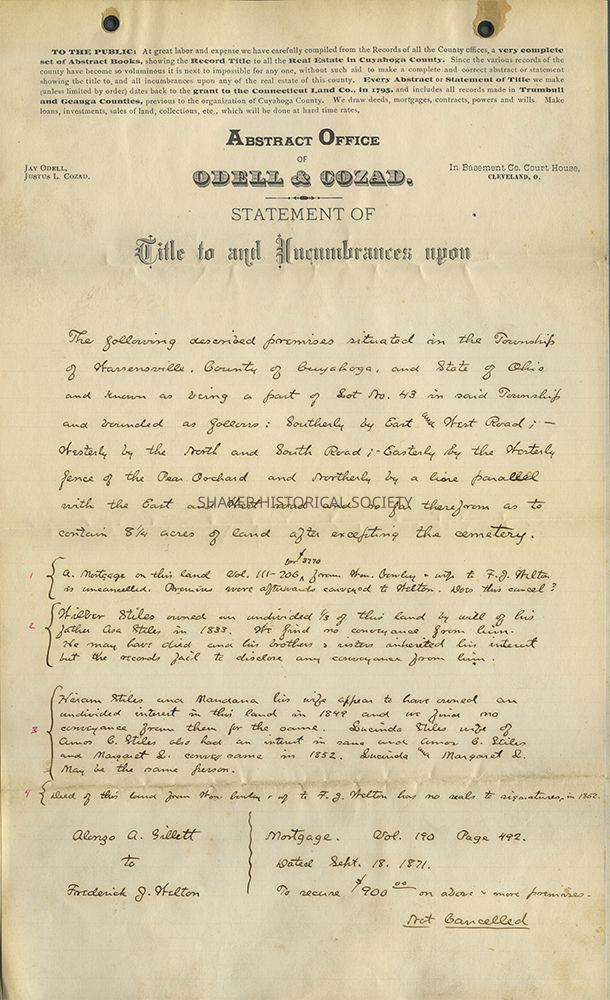 Statement of title and incumbrances for land in Lot No. 43, Warrensville Township, previously owned by William Cowley and Federick J. Welton, to Alonzo A. Gillette. Abstract created on June 18, 1881 by the Abstract Office of Odell & Cozad.