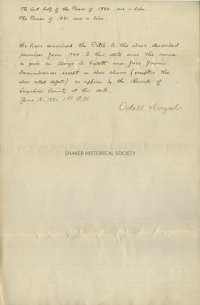 We have examined the Title to the above described premises from 1795 to this date and the same is good in Alonzo A. Gillett and free from Incumbrances except as above shown (excepting the above noted [defects?]) as appears by the Records of Cuyahoga County at this date.