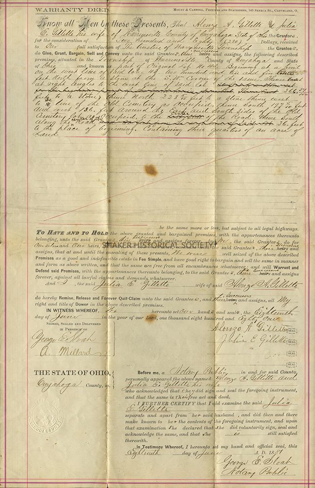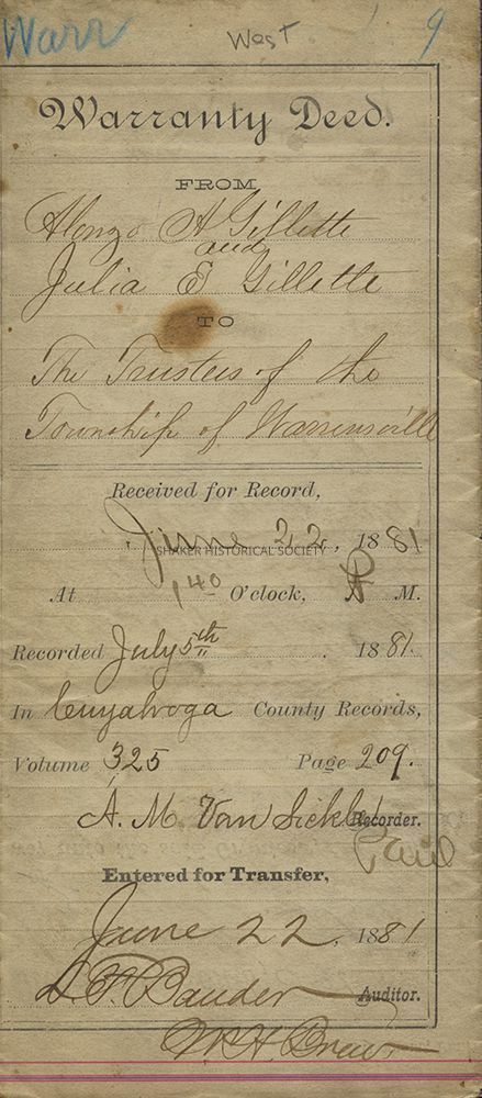Warranty deed signed June 18, 1881 from Alonzo A. Gillette and Julia E. Gillette to the trustees of Warrensville Township, Ohio for land surrounding Warrensville West Cemetery, located in present-day Shaker Heights.