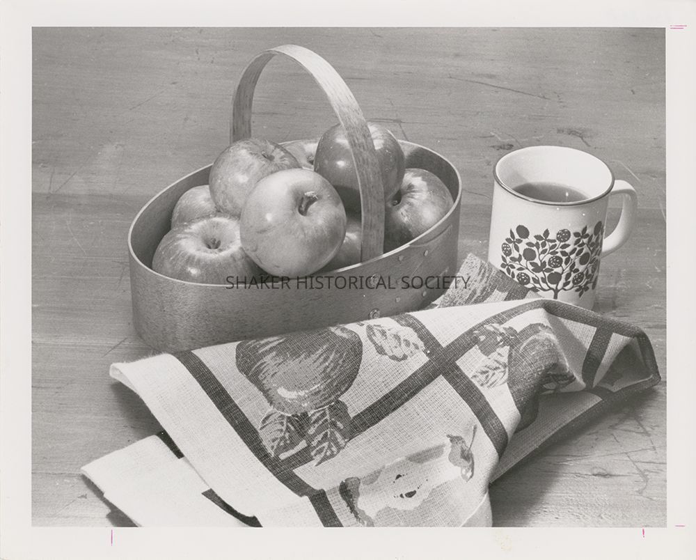 Black-and-white photograph of apples in a Shaker wooden basket next to a mug with the Shaker Tree of Life illustration. A cloth with an apple print sits in the foreground. The photograph is most likely a press photo based on information on verso and crop marks in the margins.
