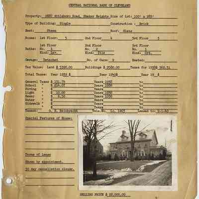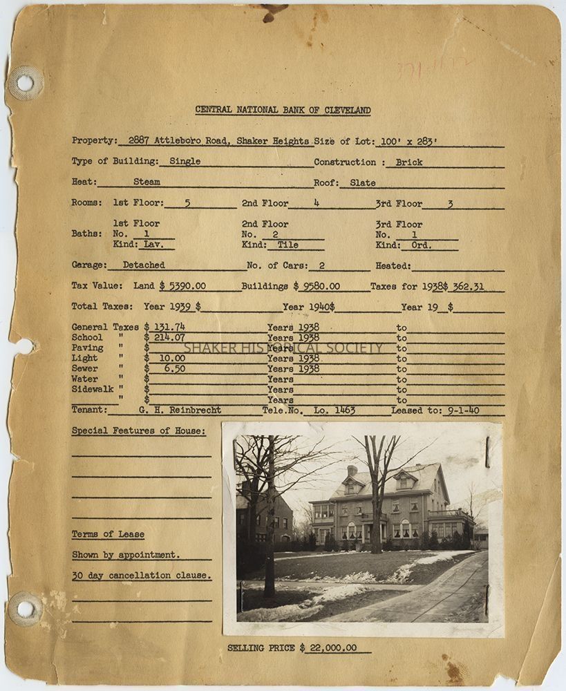 Appraisal form for 2887 Attleboro Road in Shaker Heights prepared by Central National Bank of Cleveland. Property data reflects construction and 1938 tax records with a photograph of the property taken in 1940. G. H. Reinbrecht is listed as the tenant.Collection