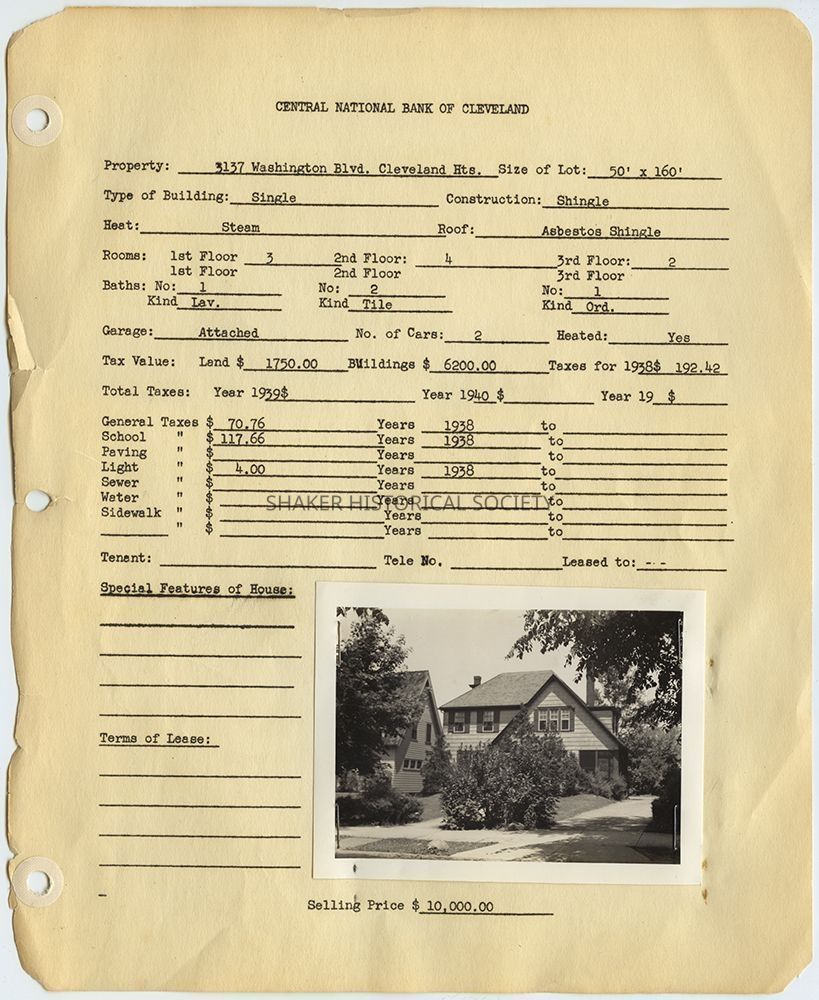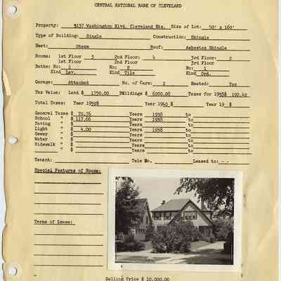 Appraisal form for 3137 Washington Boulevard in Cleveland Heights prepared by Central National Bank of Cleveland. Property data reflects construction and 1938 tax records with a photograph of the property taken in 1940.Collection