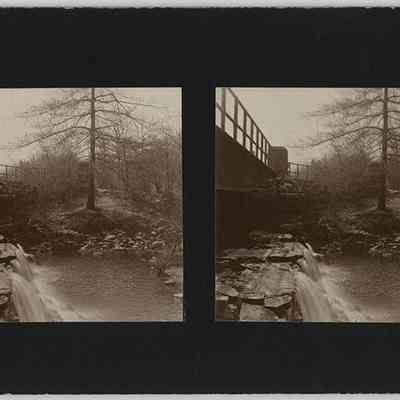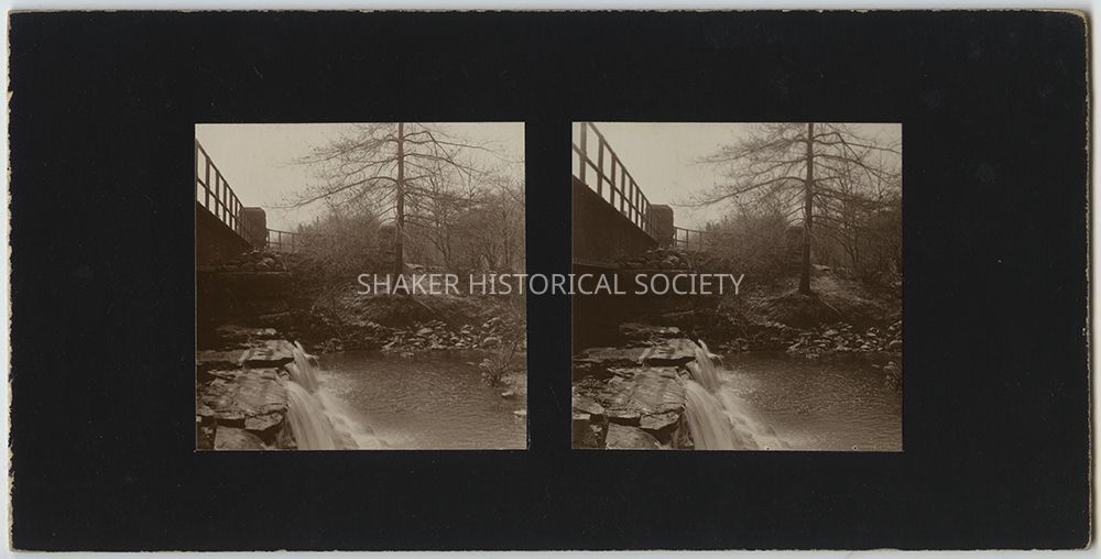 Toned black-and-white stereograph photographs by Ladis Lisy of the Brook Road bridge and dam spillway at Lower Lake. Photographs are mounted on black board with handwritten notes about the date, location, exposure, and developer on verso.Photograph Details