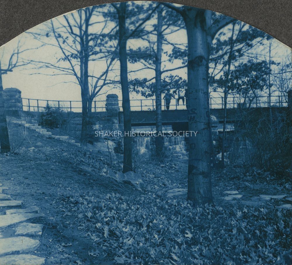 Blue-toned black-and-white stereograph photographs by Ladis Lisy of the Brook Road bridge and dam spillway at Lower Lake. Two (possibly three) people are standing on the bridge. Stone steps and paths are visible on the left. Photographs are mounted on grey board with handwritten notes about the date, location, exposure, and developer on verso.Photograph Details