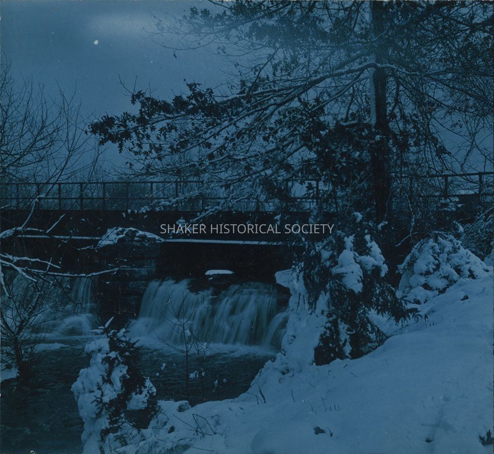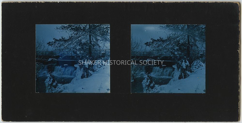 Blue-toned black-and-white stereograph by Ladis Lisy of the Brook Road bridge and dam spillway at Lower Lake. Photographs are mounted on black board with handwritten notes about the date, location, exposure, and developer on verso.Photograph Details