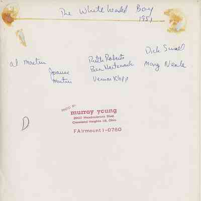 Black-and-white theatrical publicity photograph by Murray Young showing seven Shaker Players cast members in "The White-Headed Boy": (Back row) Albert Martin, Ruth Roberts, Richard Small; (Middle row) Joanne Martin, Beatrice Hertzmark, Mary Neale; and (Bottom center) Vernon Klopp. Identifying information written on verso.Photograph Details