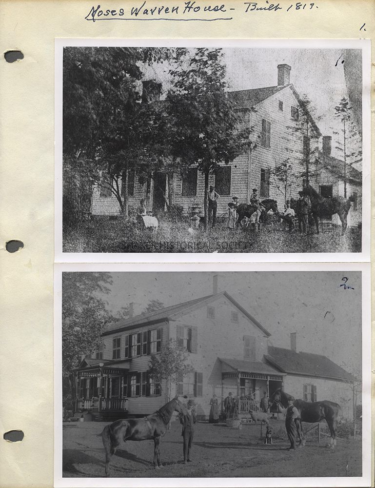 Page from a Warrensville Township scrapbook (SCR WAR 4) with undated black-and-white photographs depicting the Moses Warren House, built by Moses Warren Sr. in 1817 and later sold to John Palmer.Photograph Details