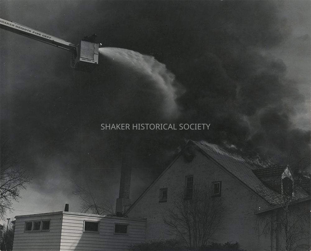 Black-and-white photograph mounted on board of the Shaker Heights Fire Department's 1968 training burn of the Blue Chip Inn steakhouse located at 16201 Chagrin Boulevard, one block west of Lee Road.Photograph Details