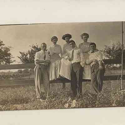 Undated black-and-white photograph of three men and three women on North Woodland Avenue (now Larchmere) off E. 130th Street (now Cheshire) near the Van Aken family farm. The photo is taped to a piece of paper identifying the people (left to right): William J. Van Aken, Florence Swallow, Anne Nickels, Percy Close, Julia Jackel, and Ben Brugge.Photograph Details