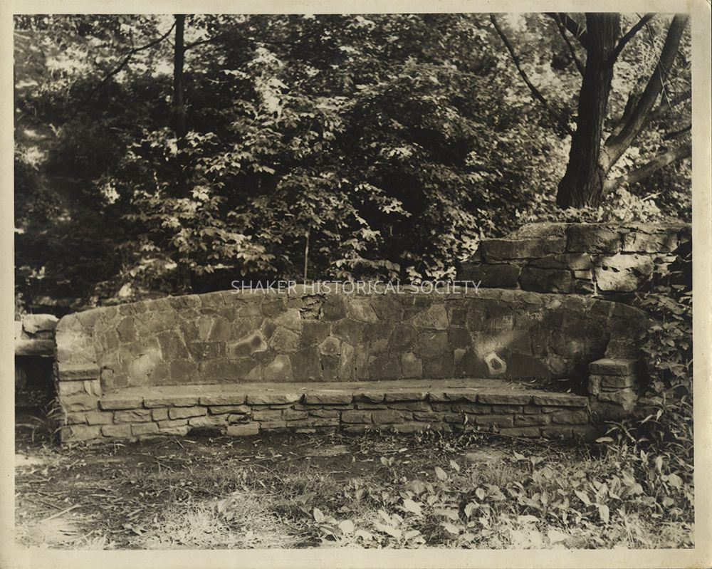 Undated black-and-white photograph of a stone bench at the North Union Shaker sawmill ruins at Lower Lake.Photograph Details