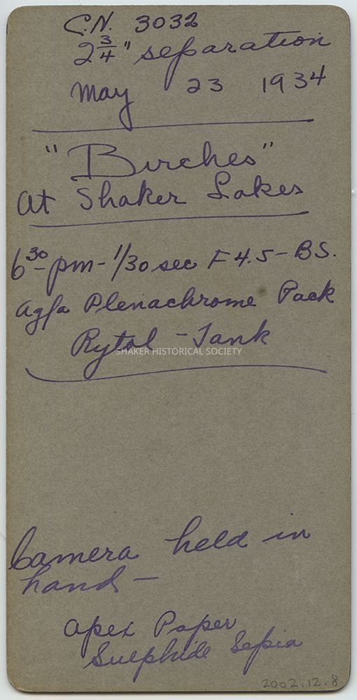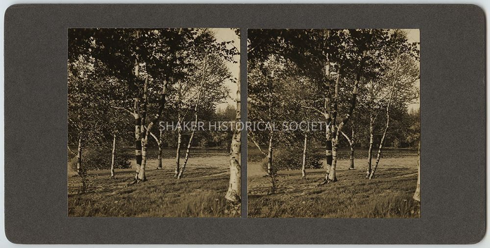Sepia toned black-and-white stereograph by Ladis Lisy of birch trees at Lower Lake. Photographs are mounted on grey board with handwritten notes about the date, location, exposure, and developer on verso.Photograph Details