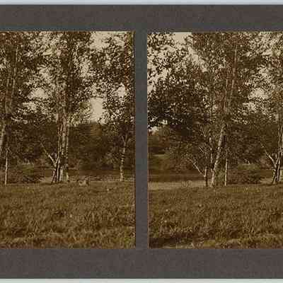 Sepia toned black-and-white stereograph photographs by Ladis Lisy of birch trees at Lower Lake. Photographs are mounted on grey board with handwritten notes about the date, location, exposure, and developer on verso.Photograph Details