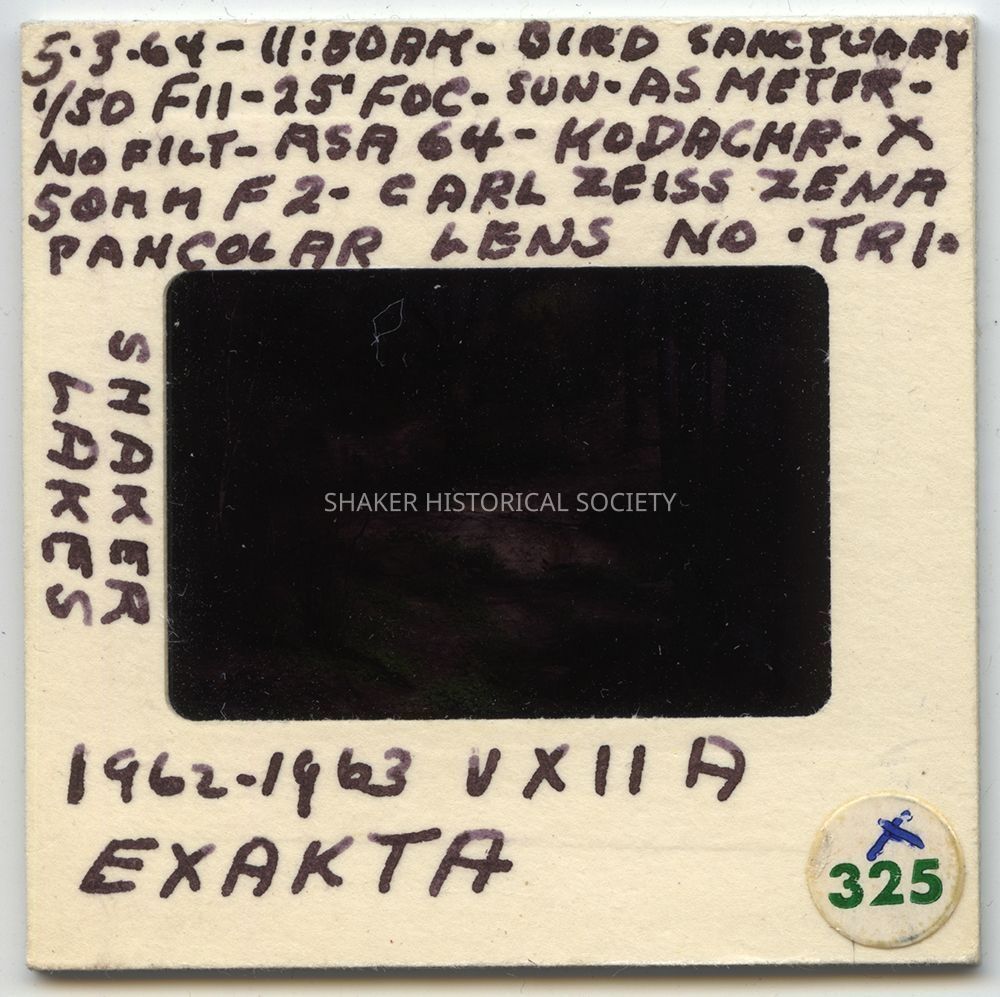 Color slide (Kodachrome X) by Ladis Lisy of the Bird Sanctuary and mill ruins at Lower Lake. Slide mount is annotated with photographic technical information.Photograph Details