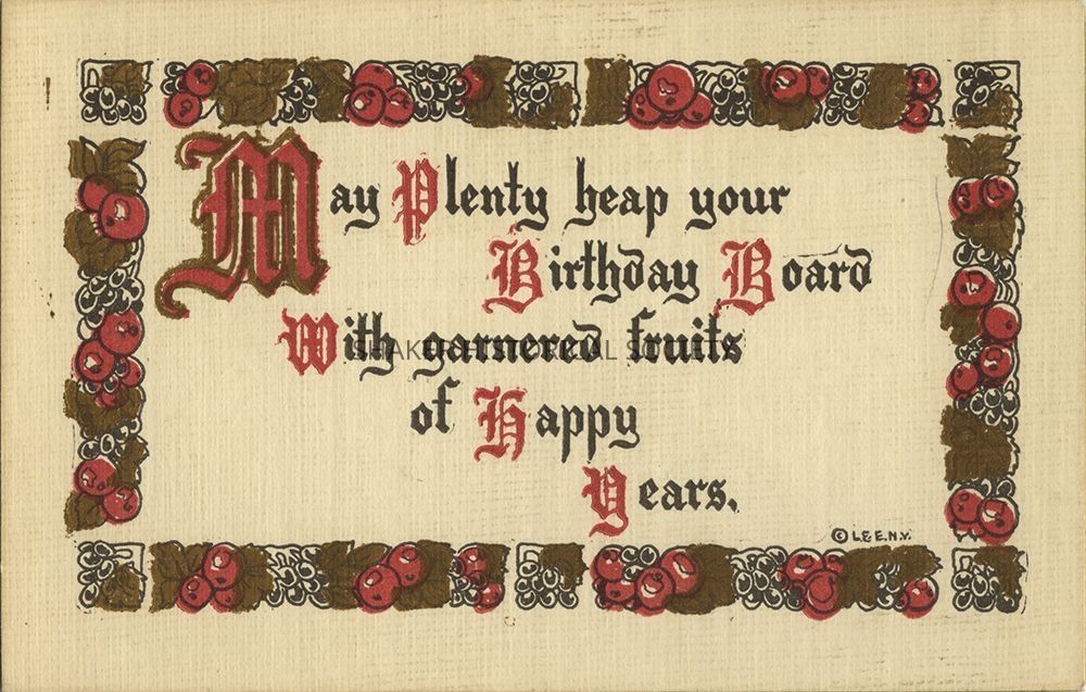 Linen birthday postcard by Leubrie & Elkus with an arts and crafts style fruit border. The message reads: "May Plenty heap your Birthday Board With garnered fruits of Happy Years."Category
