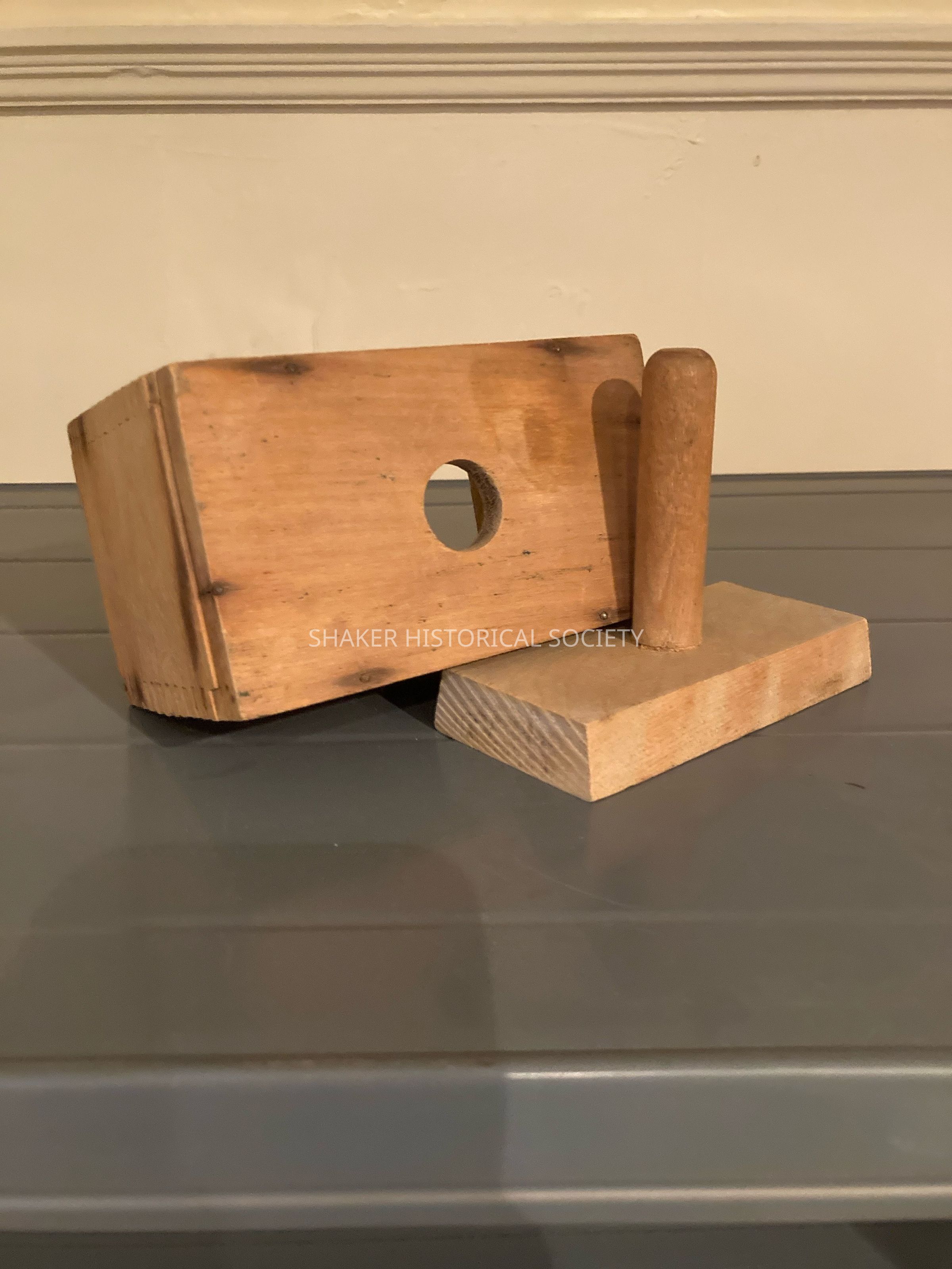 Rectangular wooden butter mold. Two parts with a plunger, fastened with box joints.Other Names and Numbers
