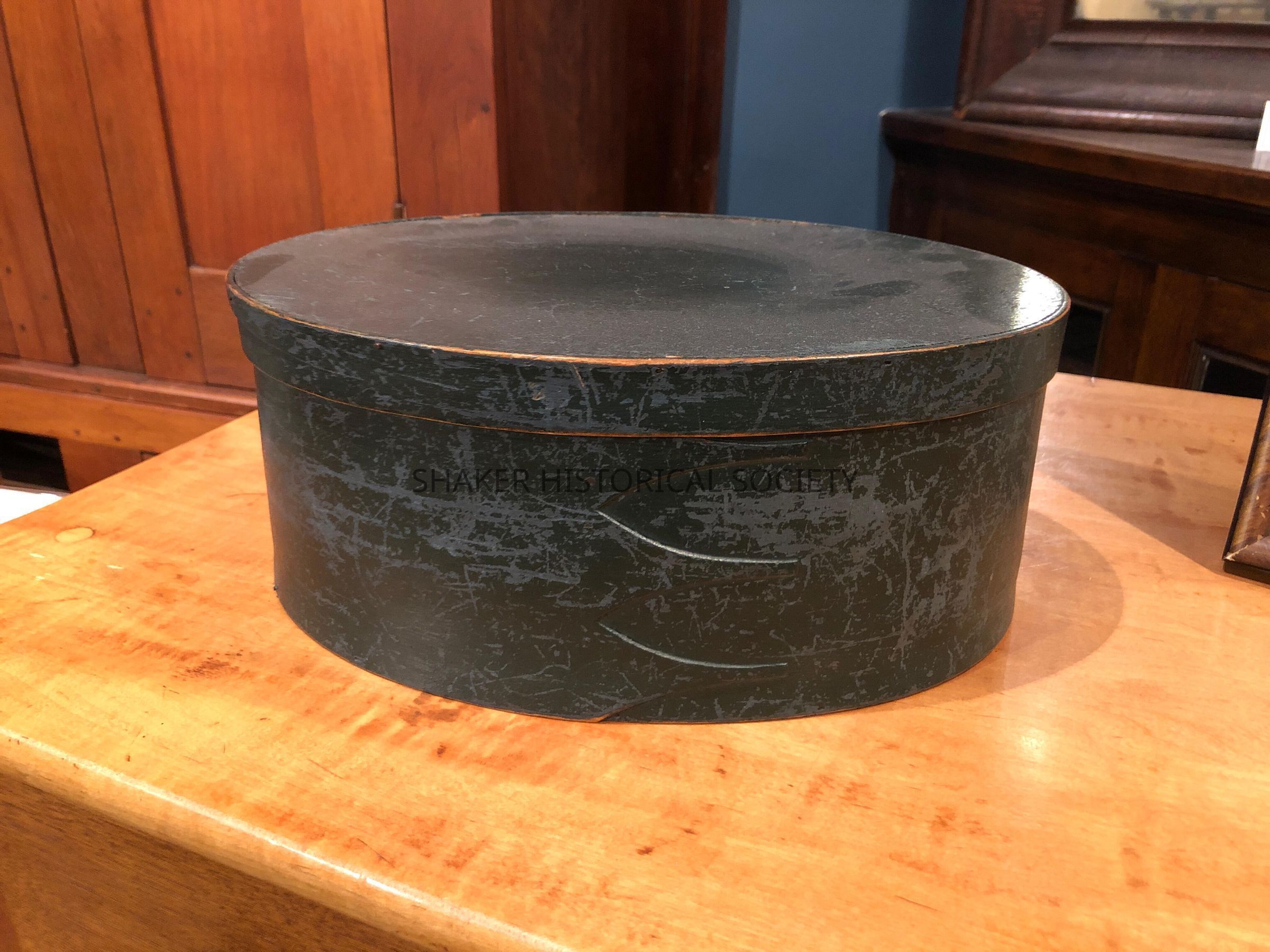 Large dark green oval Shaker box with three fingers and lid. Used as a sewing box by Alma McGill Stoll.Collection