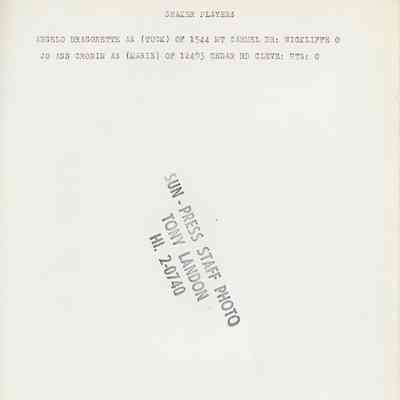 Black-and-white theatrical publicity photograph by Tony Landon of the Sun Press showing Shaker Players cast members Jo Ann Cronin and Angelo Dragonette in "Come Back, Little Sheba." Identifying information on verso.Photograph Details