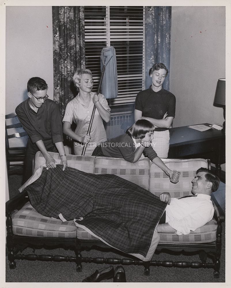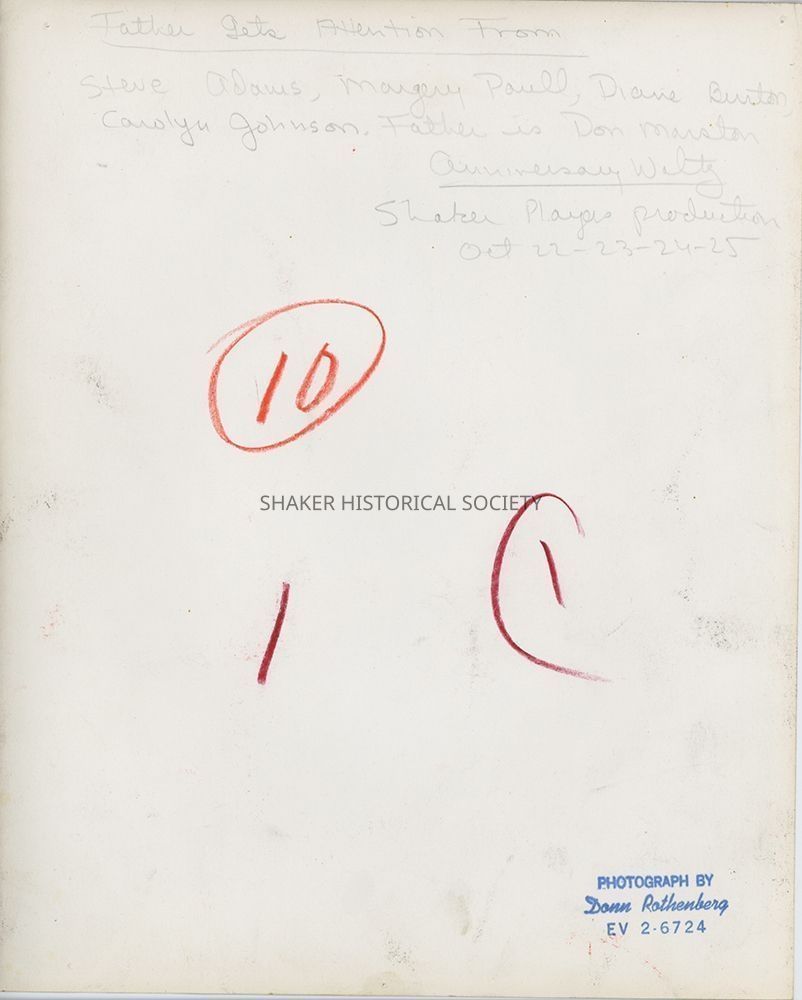 Black-and-white theatrical publicity photograph by Donn Rothenberg showing five Shaker Players cast members from "Anniversary Waltz": Steve Adams, Margery Paul, Diane Burton, Carolyn Johnson, and Don Marston (on the couch). Identifying information written on verso.Photograph Details