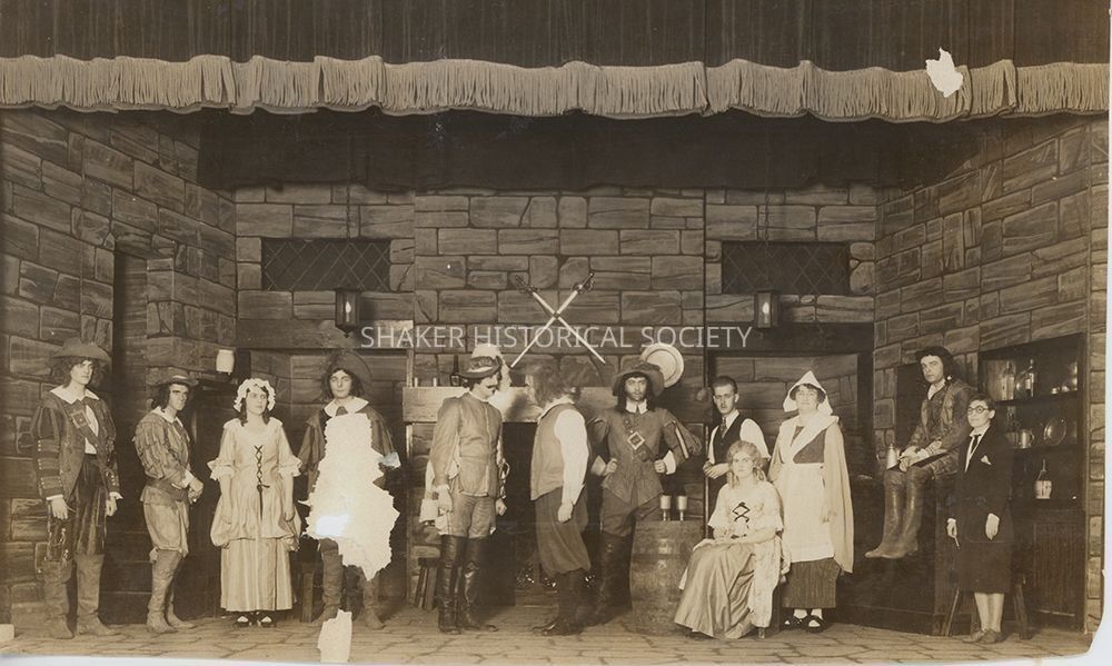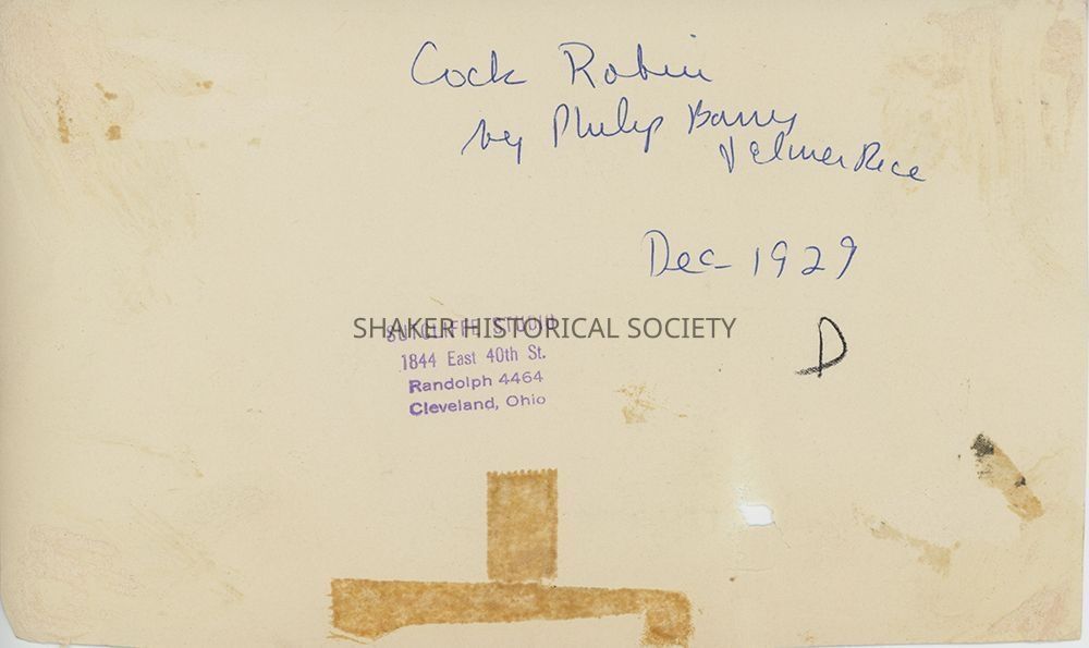 Black-and-white theatrical publicity photograph by Sutcliffe Studio showing the Shaker Players cast of "Cock Robin." Identifying information written on verso.Photograph Details