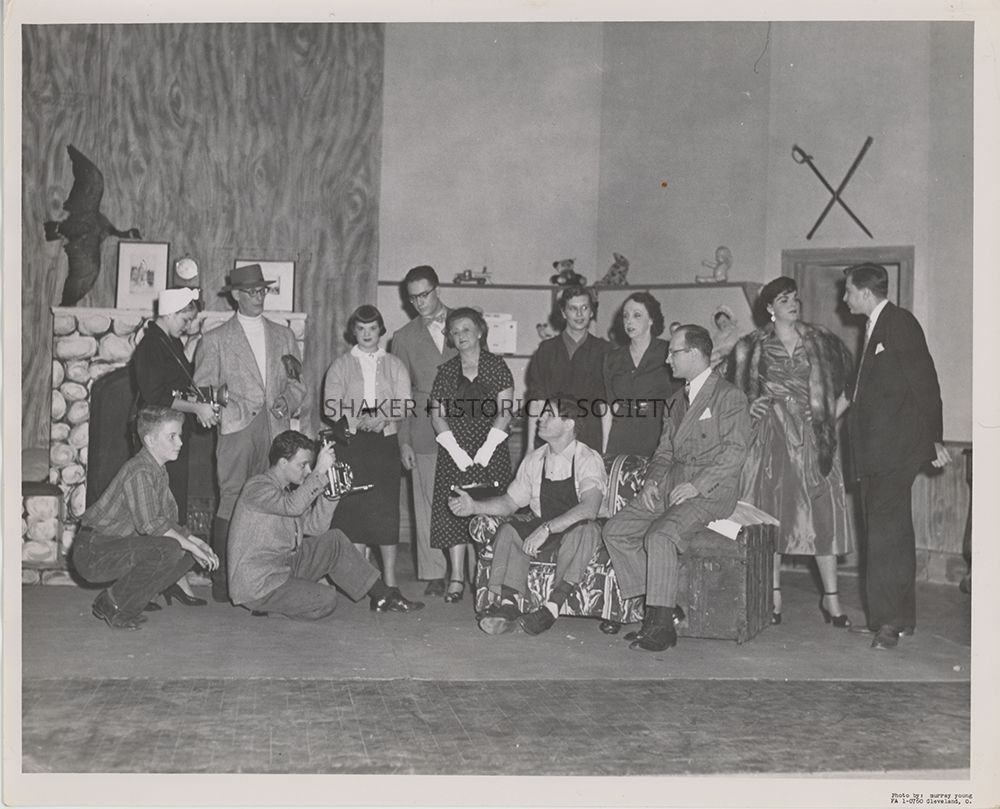 Black-and-white theatrical publicity photograph by Murray Young of Shaker Players cast members with the set of "Mr. Barry's Etchings."Photograph Details
