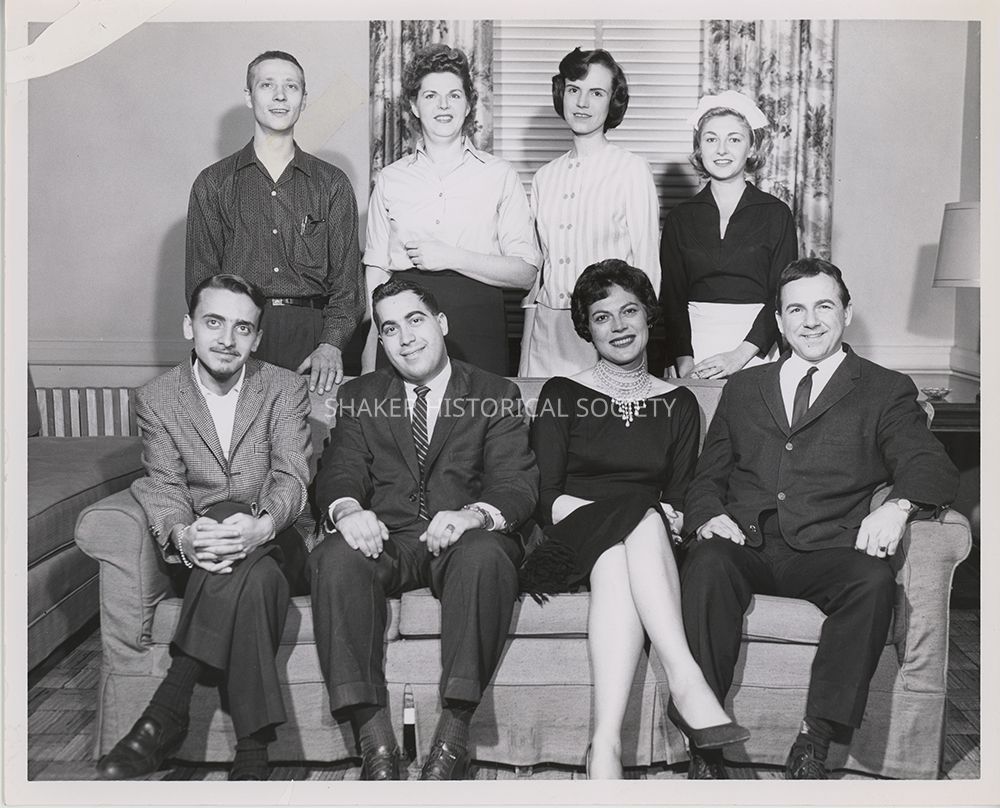 Black-and-white theatrical publicity photograph by Jim Brown & Associates photographers showing eight Shaker Players cast members, four seated on a couch and four standing behind the couch, in "Someone Waiting." Marvin Karp and Marilyn Bennett are seated in the center of the couch.Photograph Details