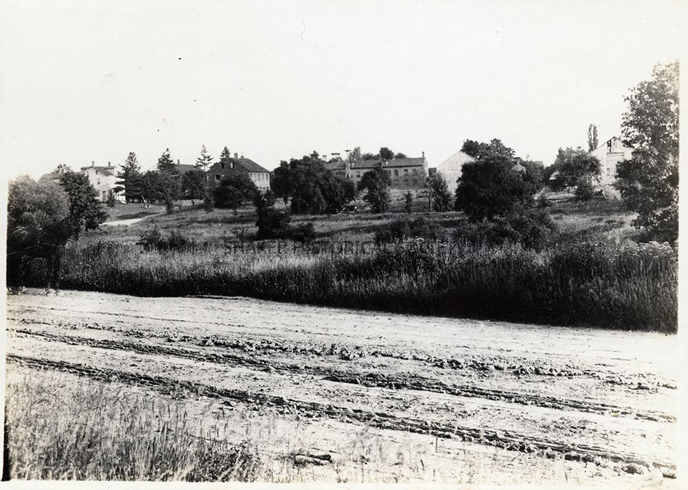 Plate 6 from from Shakers & Kirtland by Louis Baus showing a northwest view of Center Family buildings of the North Union Shaker Village along Lee Road. Photograph taken from South Park Boulevard.
