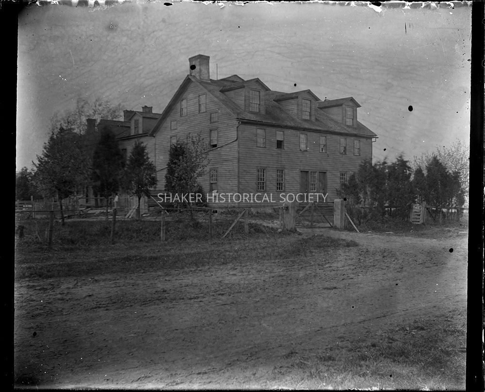 Glass plate negative showing a southeast view of the Center Family's dwelling house of the North Union Shaker Village along Lee Road.Photograph Details