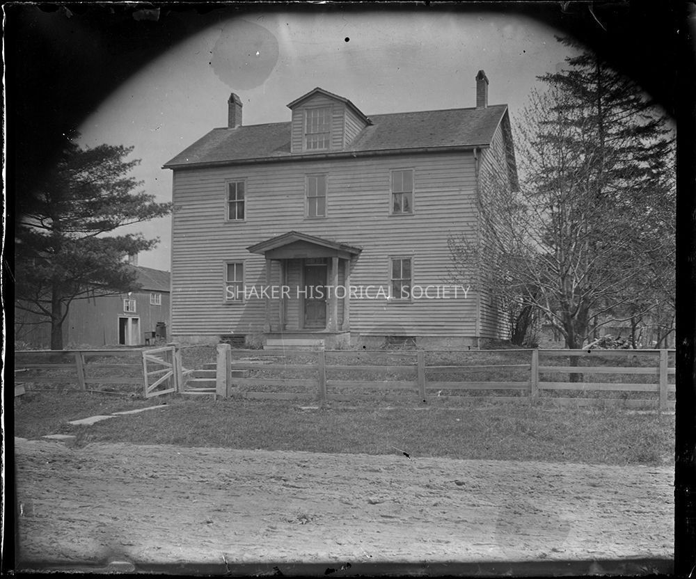 Glass plate negative showing a southwest view of the Center Family's office of the North Union Shaker Village on Lee Road. The shed at Lee Road and South Park Boulevard is visible on the left.Photograph Details