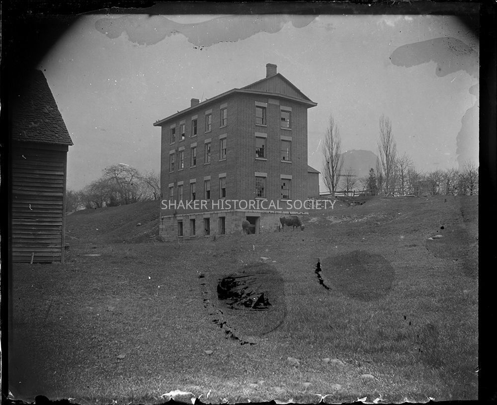 Glass plate negative showing a northwest view of the Center Family's woolen mill of the North Union Shaker Village, with many windows broken and in disrepair. Part of the blacksmith shop is visible on the left.Photograph Details