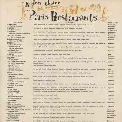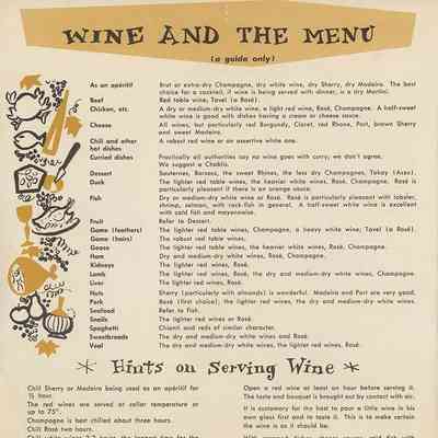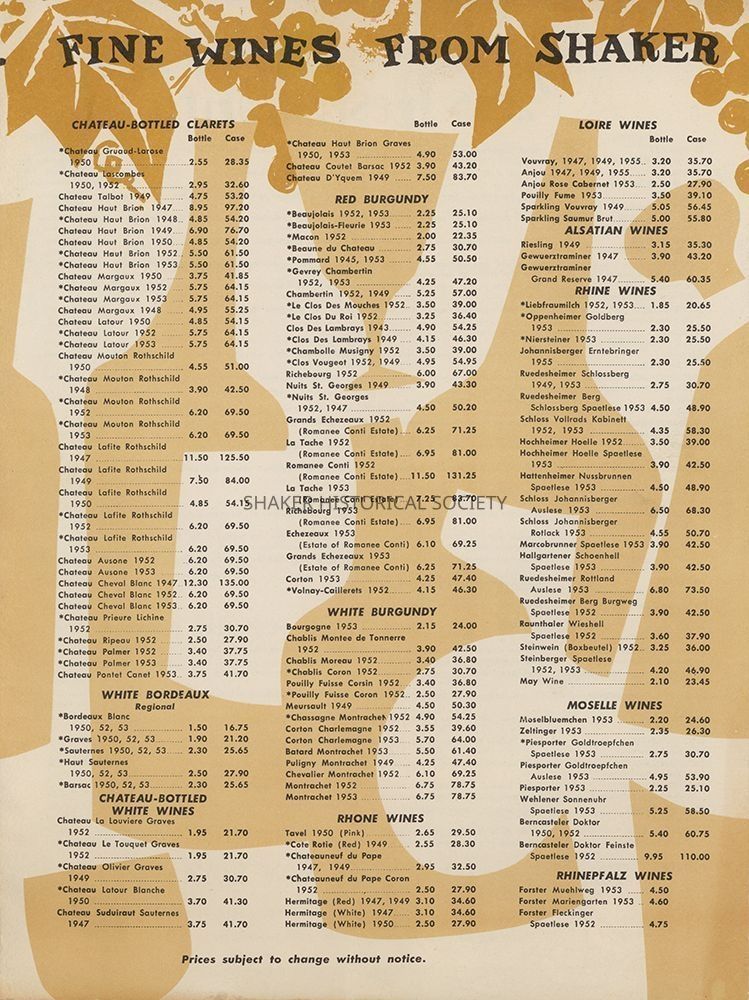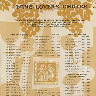 Shaker Square Beverages, Inc. trifold wine list from 1957. Heading along interior pages reads "Wine Lovers' Choice...Fine Wines from Shaker Square Beverages, Inc." Another page features a selection of Paris restaurants, while the back page offers wine and food pairings along with tips on serving wine.Acquisition