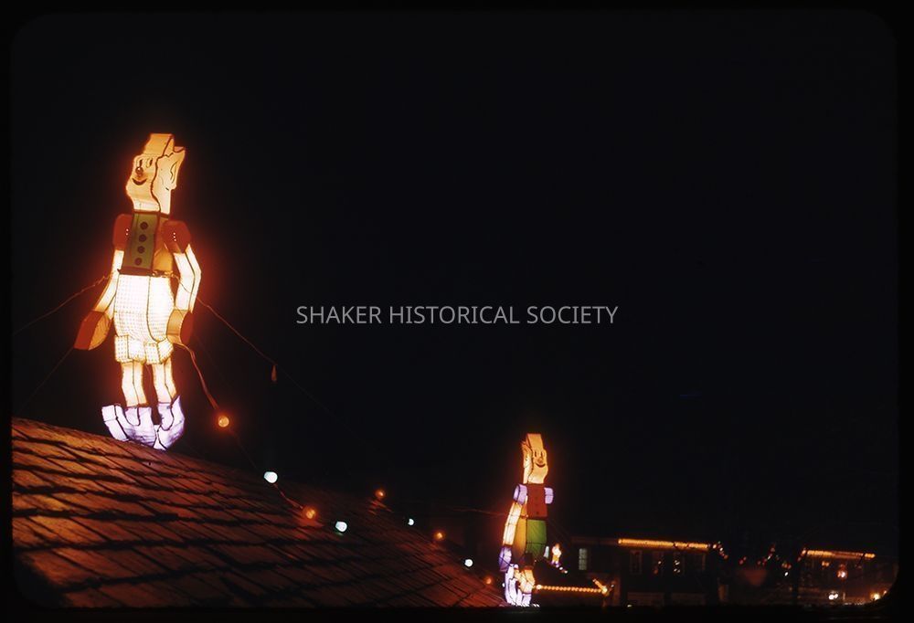 Color slide (Kodachrome) of two elf Christmas decorations on the roof of an unidentified Shaker Square building at night.Photograph Details