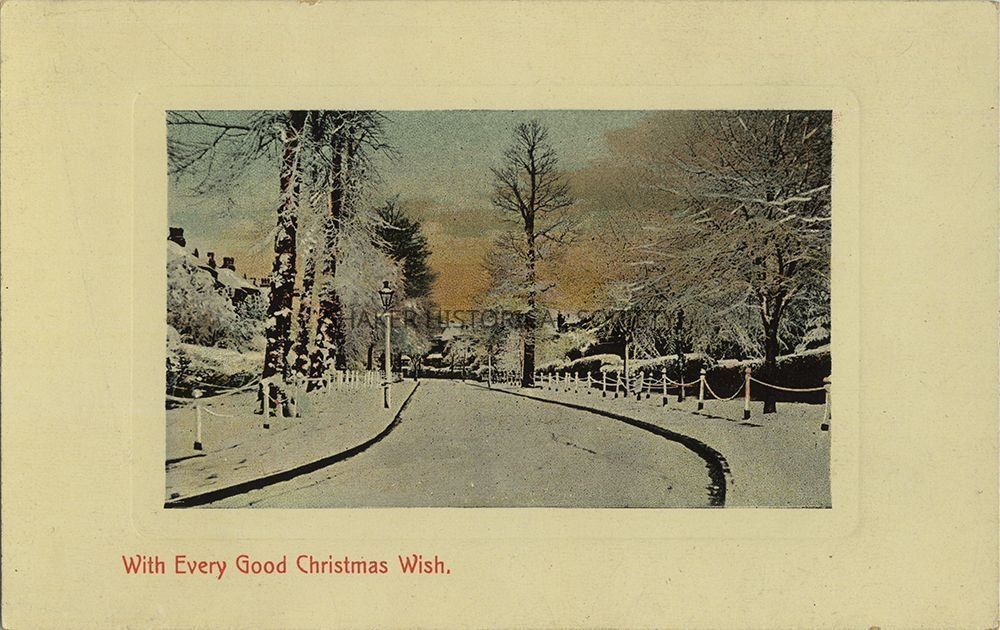 Colored photograph Christmas postcard published by Millar & Lang with a snowy streetscape from an unknown location. "With Every Good Christmas Wish." is printed in red below the image. "No. S 308" is printed below Millar & Lang's logo.Category