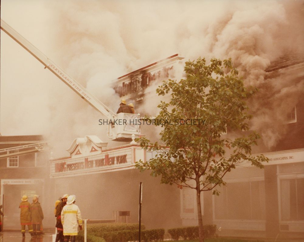 Color photograph of firefighters responding to the 1981 fire at the Colony Theatre in Shaker Square.Photograph Details
