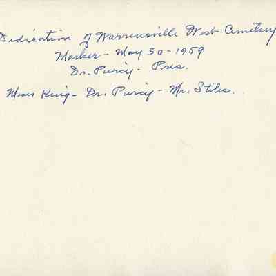 Black-and-white photograph on yellowed paper of Moses King, Dr. Harry Piercy, and Mr. Stiles at the dedication of the Warrensville West Cemetery marker on May 30, 1959.Photograph Details