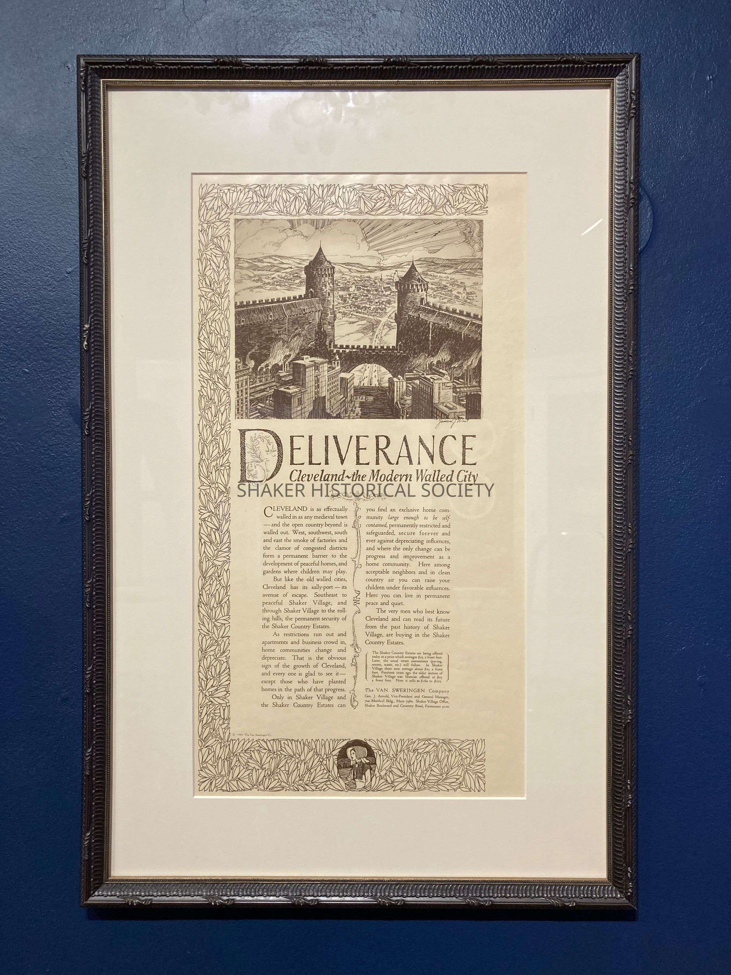 Framed and matted broadsheet featuring a 1927 Van Sweringen Company advertisement. Titled "Deliverance: Cleveland—the Modern Walled City," this broadsheet was one of nine published in the Plain Dealer between October 23 and December 18, 1927. The advertisement features an illustration by James G. West, a commercial artist who exhibited in the Cleveland Museum of Art's May Show in the 1930s.Acquisition