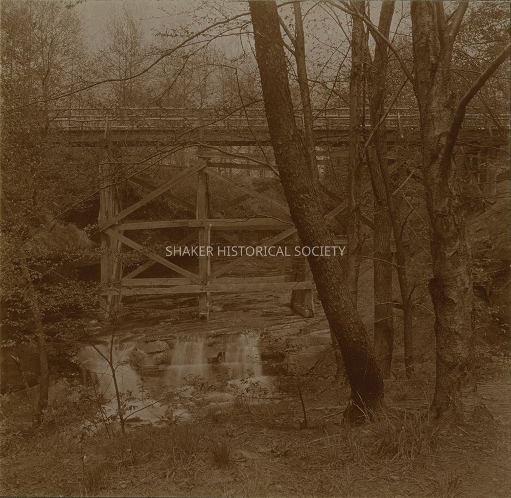 Toned black-and-white stereograph by Ladis Lisy of a bridge over Doan Brook near Coventry off Fairmount (possibly Fairhill) Road. Photographs are mounted on grey board with handwritten notes about the date, location, exposure, and developer on verso.Photograph Details