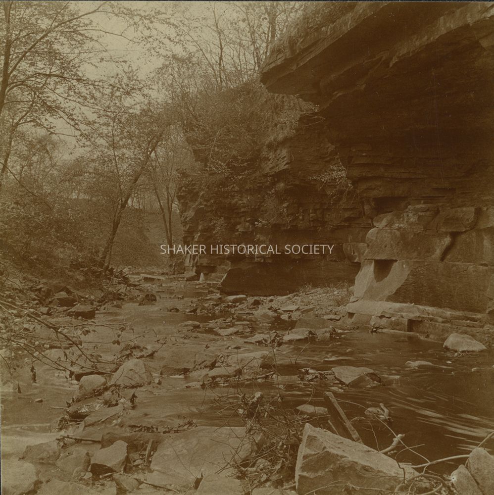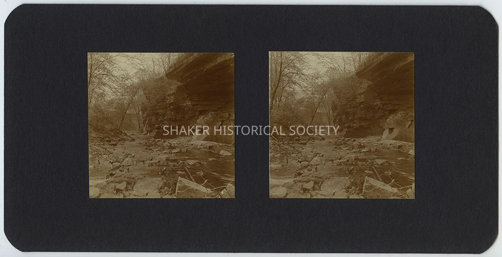 Sepia-toned black-and-white stereograph by Ladis Lisy of a Doan Brook Gorge near Coventry Road. Photographs are mounted on black board with handwritten notes about the date, location, exposure, and developer on verso.Photograph Details