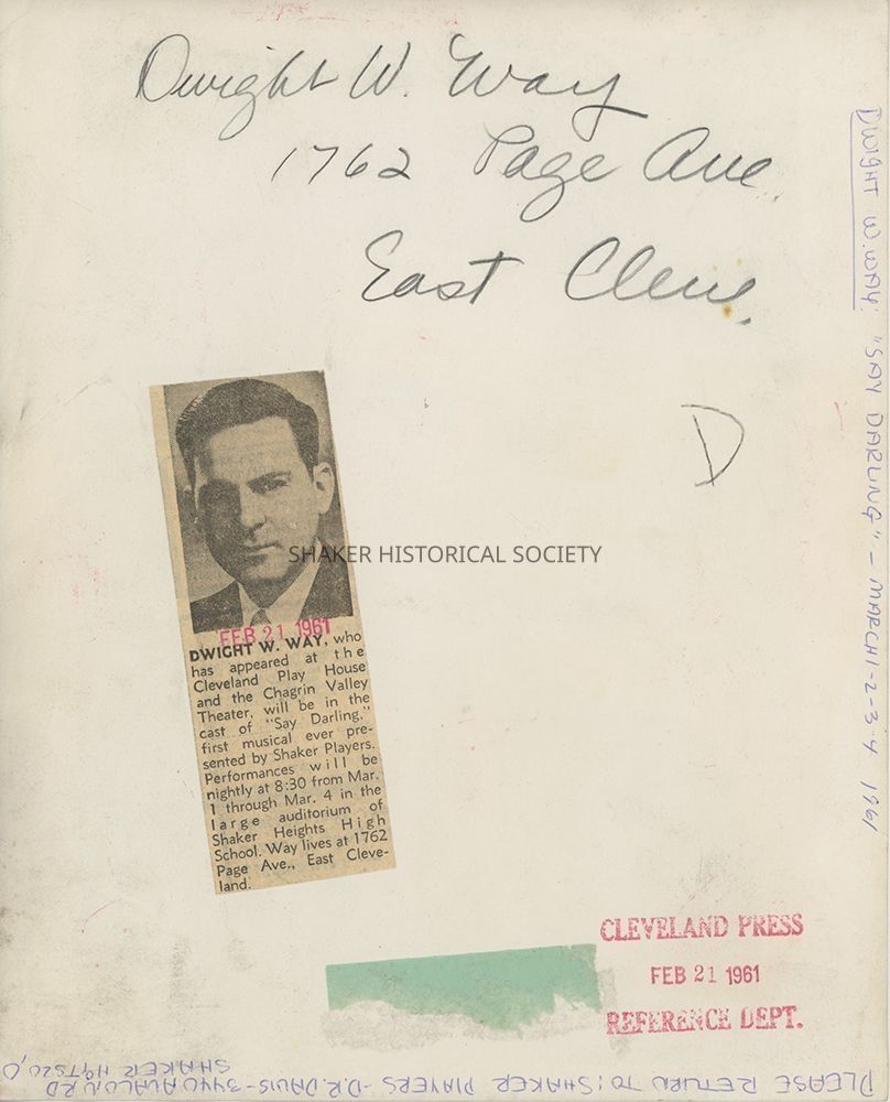 Black-and-white headshot of Shaker Players cast member Dwight W. Way from "Say, Darling." Identifying information on verso.Photograph Details