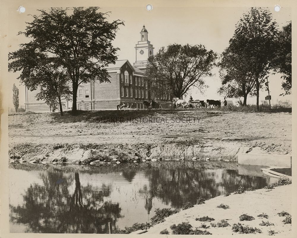 Black-and-white photograph of Shaker Heights High School, now Woodbury, under construction with horse-drawn wagons and trees. The pond located near the South Woodland/Ashford intersection is visible in the foreground. Parts of the building, including the clock tower, appear to be traced over with pen or pencil. Photo is likely taken from the South Woodland/Ashford intersection looking southwest at the school.Photograph Details