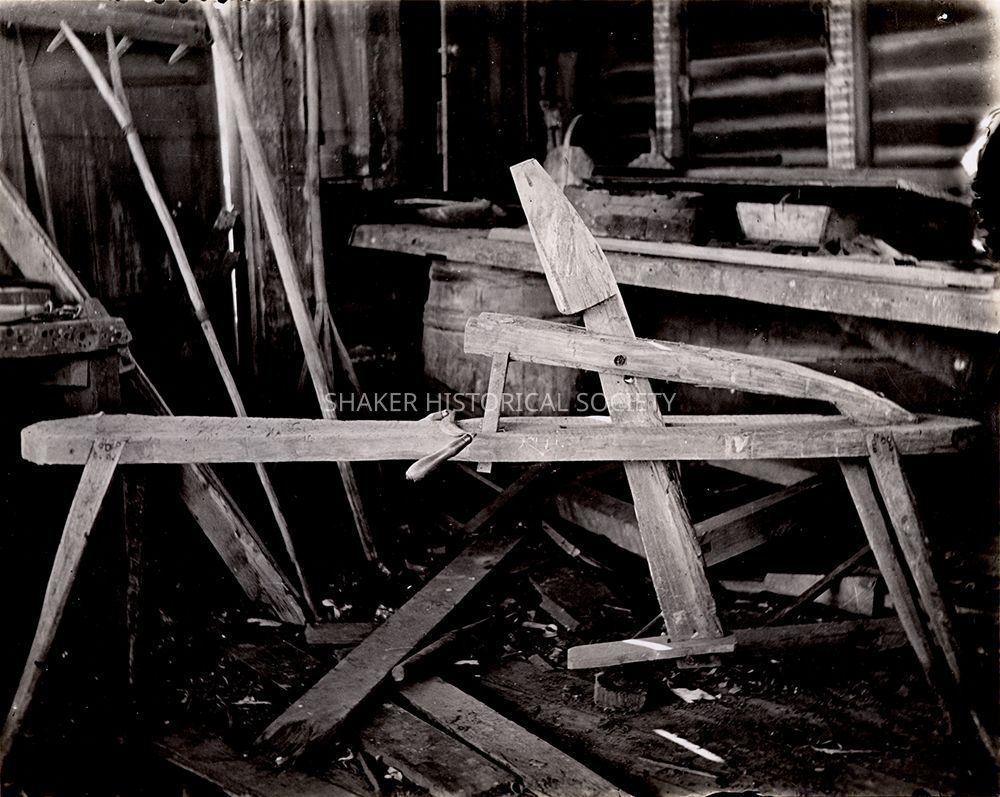 Baus description: "In a corner of the old workshop, deserted for years, we still find the old time shaving horse and knife. Theirs was the primative [sic] method, no steam or machinery. The brawny muscle was the power and the work was done well."Photograph Details