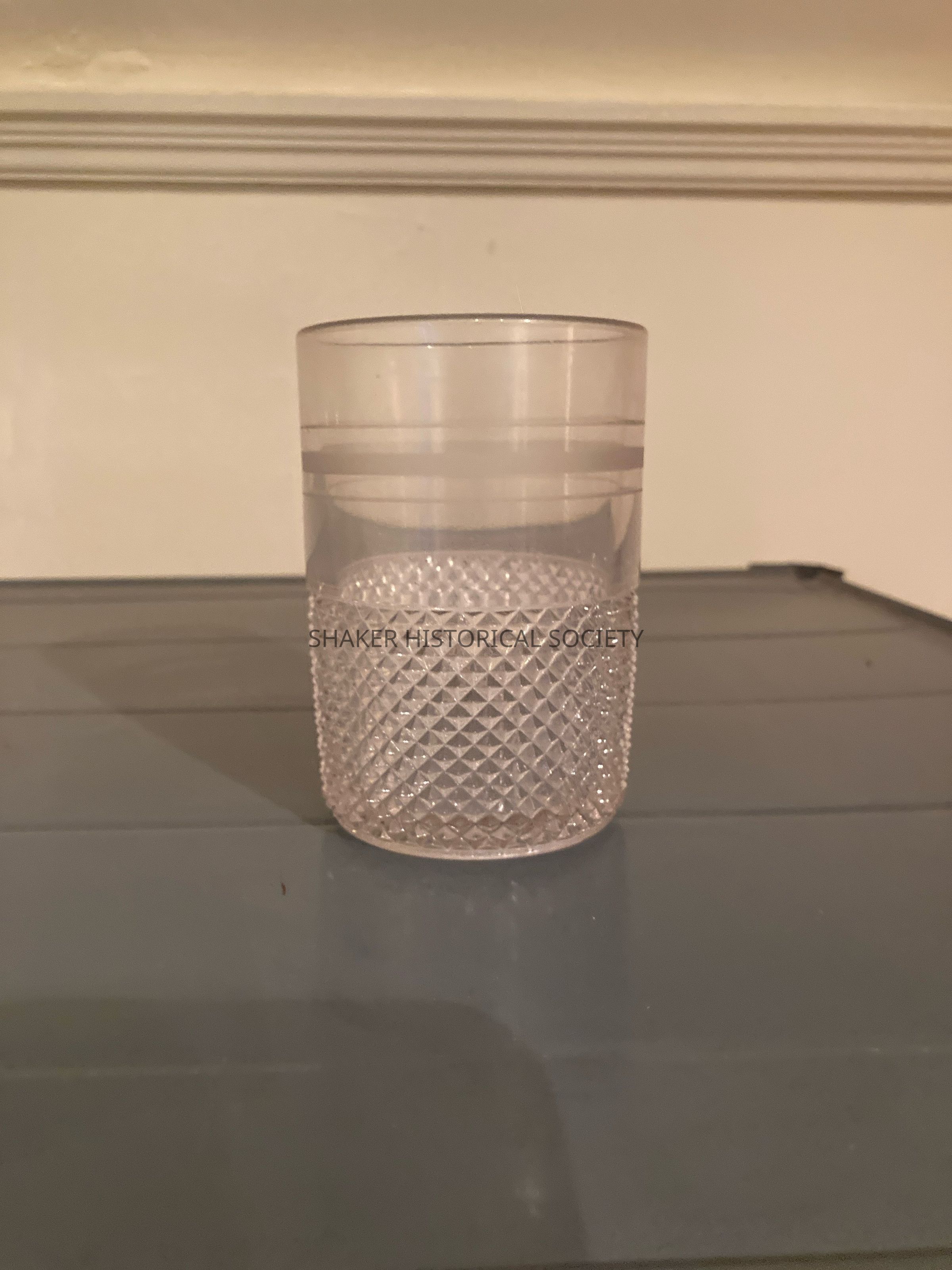 Glass tumbler with diamond design on bottom half and simple bands on the top half. Identical to R-292.3Location
