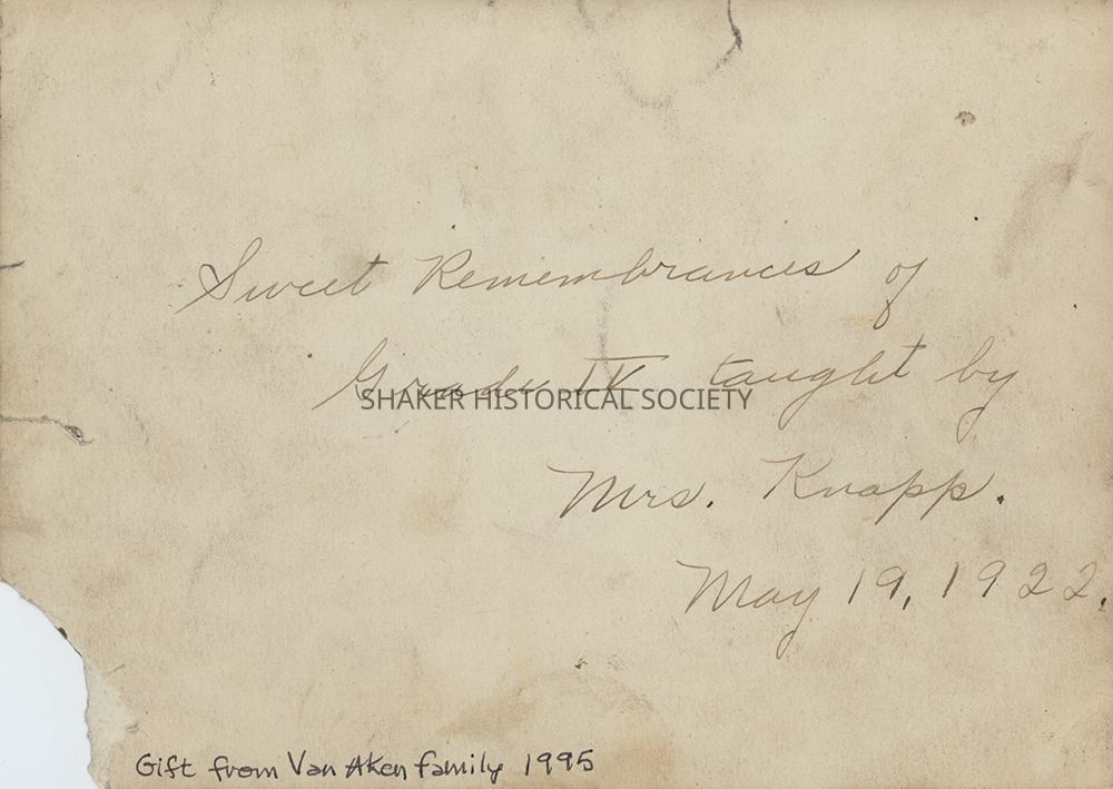 Black-and-white class photograph of 4th Grade, Room 4 at Boulevard School in Shaker Heights taken on May 19, 1922. Handwritten note on verso says "Sweet Remembrances of Grade IV taught by Mrs. Knapp. May 19, 1922."Photograph Details