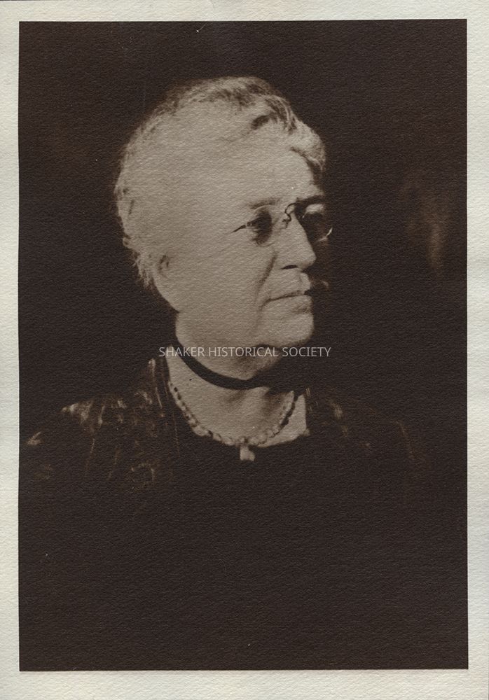 Undated black-and-white reproduction of a bust-length portrait of Eliza Kingsley Arter wearing a dark dress and glasses.Photograph Details